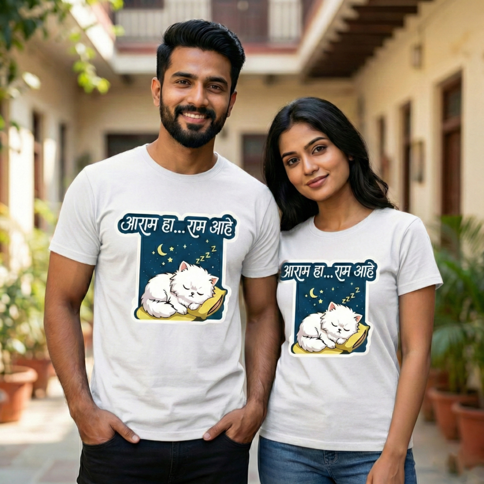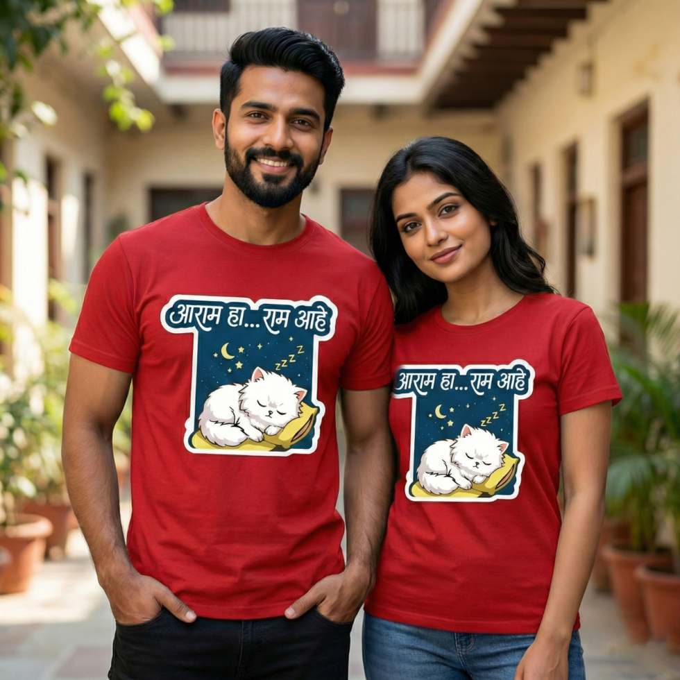Say hello to our unisex cotton “Aaram Ha.. Ram Ahe” t-shirt — a silly play on the old adage “Aaram Haram Ahe.”